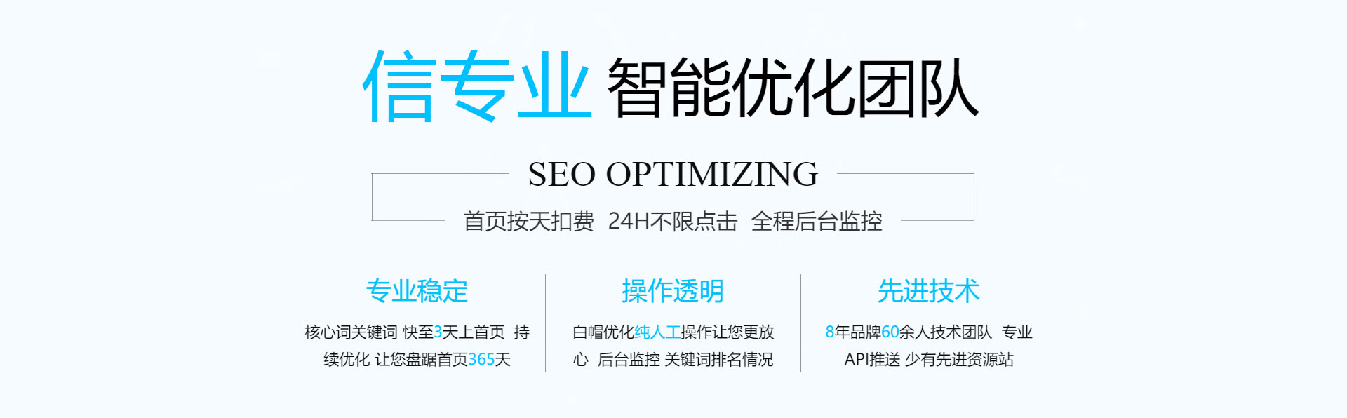 關鍵詞優(yōu)化,無效果退款!專業技術管控賬戶,減少無效點擊,全方位網絡推廣,讓您的信息遍布互聯網。